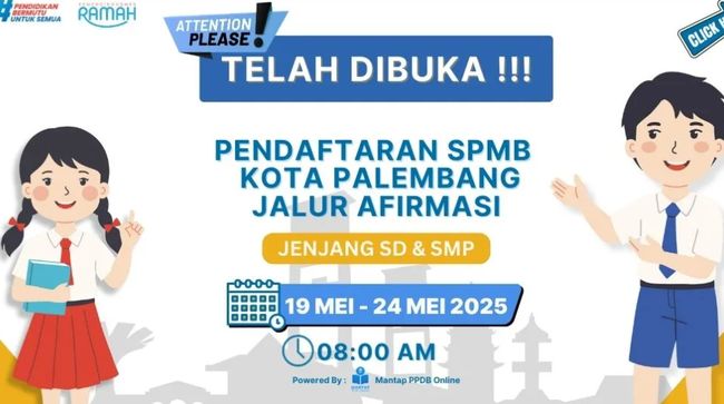 Seleksi Penerimaan Murid Baru (SPMB) di Kota Palembang untuk SD dan SMP resmi dibuka. Jalur afirmasi menjadi yang pertama membuka pendaftaran sejak 19 Mei 2025.