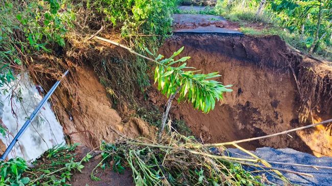 "Akibat intensitas hujan yang tinggi dan saluran irigasi yang meluap ke bahu jalan sehingga terjadinya proses erosi yang memakan bagian jalan berakibat jalan putus dan tidak bisa dilalui. Luas tanah longsor kurang lebih 2 kapling kebun kopi," tuturnya.