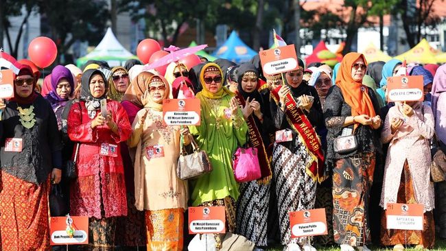 Ratusan perempuan hadir dengan balutan kebaya beraneka warna dan motif, di halaman Kantor Gubernur Sumatera Selatan pada, Minggu (20/7). Kebaya ini digunakan dalam rangka memperingati Hari Kebaya Nasional.