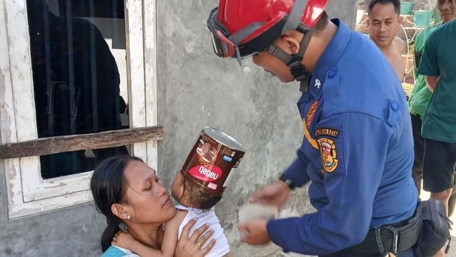 Seorang batita di Bandar Lampung kepalanya terjepit kaleng biskuit. Keluarga meminta bantuan ke petugas damkar.