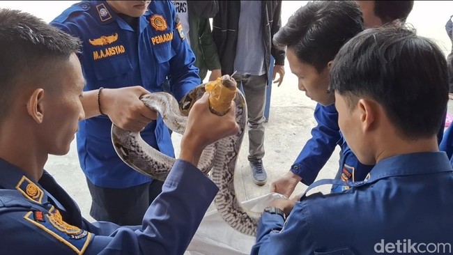 Petugas Rescue Damkar Kota Palembang mengevakuasi ular sawa jenis piton sepanjang 3 meter di permukiman warga. Tak hanya itu, petugas juga menemukan 15 belas telurnya.