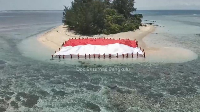 Bendera Merah Putih berukuran besar berkibar di Pulau Tikus, Bengkulu. Bendera berukuran 40x20 meter itu dikibarkan oleh tim Kantor Pencarian dan Pertolongan (Basarnas) Bengkulu bersama unsur-unsur terkait.