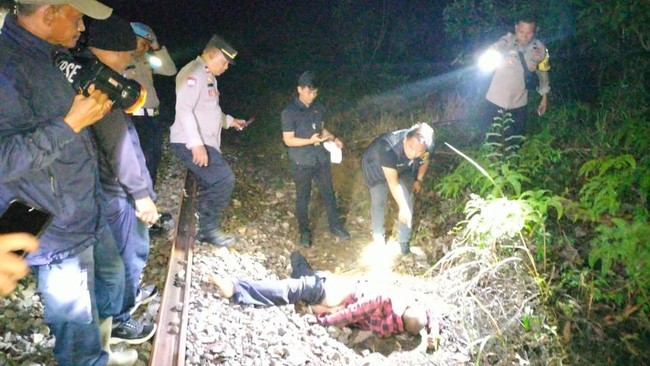 Jasad pria paruh baya tanpa identitas ditemukan di jalur rel kereta api, Prabumulih, Sumatera Selata. Diduga korban tewas usai tertemper babaranjang.