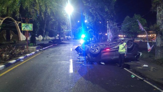 "Sehingga roda depan bagian kanan naik ke atas pulau jalan dan menabrak beton tanaman, kemudian menabrak dua unit tiang lampu penerangan jalan kemudian kendaraan terbalik," katanya.