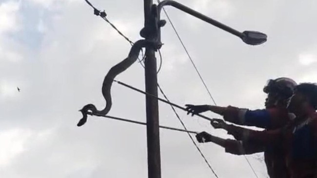Setiba di sana, kata dia, warga sudah ramai menyaksikan ular tersebut bergelantungan di tiang listrik. Karena dikhawatirkan ular tersebut nantinya kesetrum hingga membahayakan warga sekitar yang melintas sehingga Yoni berinisiatif melaporkannya ke Damkar.