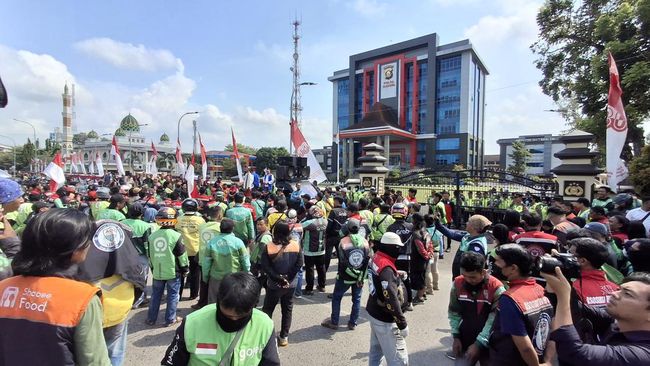 Sejumlah massa yang tergabung dalam DPD Asosiasi Driver Online (ADO) Sumatera Selatan tiba di depan Mapolda Sumsel sekitar pukul 09.23 WIB. Massa aksi datang menggunakan sepeda motor.