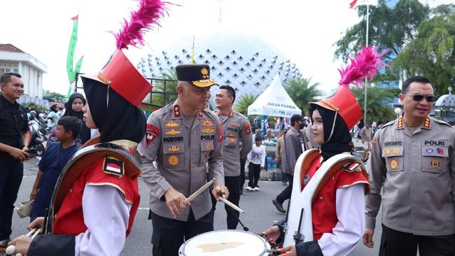 Diakhir kunjungan, Kapolda terlihat memberikan semangat kepada para peserta parade karnaval. Ia tampak berbaur dan tak canggung mencoba beberapa peralatan atau atribut yang dimainkan oleh para peserta parade karnaval.