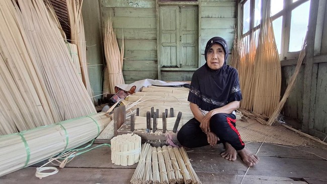 "Kalau bahannya (daun nipah) kita pesan dari Jalur daerah Banyuasin. Buatnya ini lumayan susah, jadi kalau sudah lelah istirahat dulu, besok lanjut lagi tapi kadang malam lanjut lagi juga. Prosesnya 3 hari baru selesai dari selesai jamur kemudian dipilih trus ditarik-tarik, baru dipotong-potong, yang rusak dibuang," ujarnya.