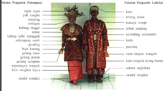 Telinga pengantin memakai perhiasan sumping dan anting. Bagian badan memakai baju kurung dari kain beludru. Kain yang digunakan pengantin adalah kain songket. Bagian leher pengantin mengenakan hiasan kalung kebo munggah serta kalung ringgit. Bagian baju kiri dan kanan menggunakan selempang sawit. Bagian pinggang mengenakan sabuk wool dan pending.