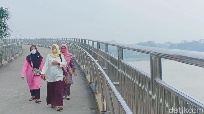 Ibu-ibu terlihat mengenakan masker saat berjalan di jembatan terpanjang Gentala Arasy (Foto: Ferdi Al Munanda)