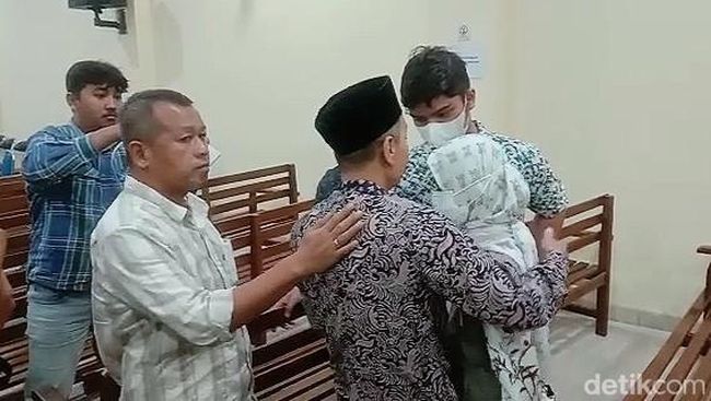 Kemudian, terdakwa Karomani yang tengah duduk di kursi pesakitan pun berdiri dan langsung mendatangi kedua anaknya yang sedari pagi telah turut menyaksikan proses persidangan ayahnya.