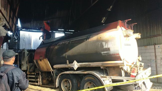 Tampak juga beberapa anggota kepolisian melakukan pemeriksaan terhadap mobil tangki Pertamina berkapasitas 16.000 liter bernomor polisi B 9435 SFU dengan kondisi terbakar.