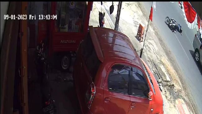 Dari rekaman kamera CCTV terlihat korban yang tengah mengendarai sepeda motor di Jalan Kartini, Bandar Lampung tiba-tiba terjatuh setelah diserempet mobil berwarna silver yang beli diketahui jenisnya.