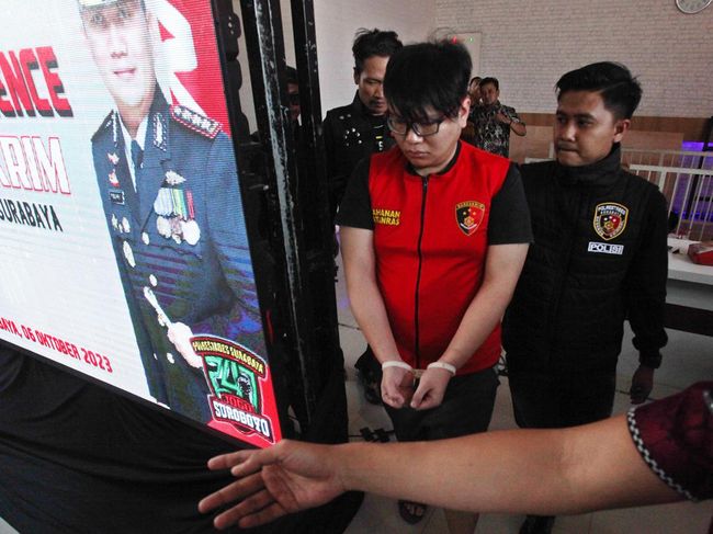 Ronald dihadirkan polisi dalam keterangan pers, Jumat (6/10/2023). Ia mengenakan oren dan berkacamata itu hanya tertunduk lesu. Dia bungkam seribu bahasa saat polisi mengungkap detail kasusnya di Gedung Pesat Gatra Polrestabes Surabaya.