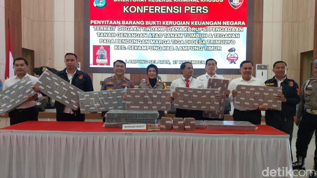 "Uang ini disita dari Bank BRI cabang Kota Metro. Yang ini merupakan barang bukti uang korupsi dari penggantian ganti rugi bidang lahan yang terdampak genangan Bendungan Margatiga Lamtim yang sudah terbayar namun ter-pending kepada 48 orang pemilik bidang lahan," katanya, Senin (27/11/2023).