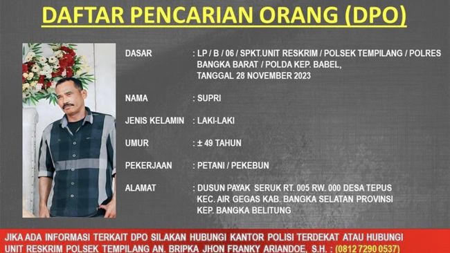 Polisi pun sudah membentuk tim gabungan dari Jatanras Polda Babel, Polres Bangka Barat, dan Polsek Tempilang untuk memburu Supri.