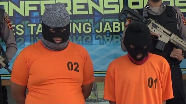 Kedua tersangka mengenakan baju tahanan dan wajah yang tertutup sebo hitam. Mereka sebelumnya ditangkap di loket travel Jalan Merdeka III, Kecamatan Tungkal Ilir, Kabupaten Tanjab Barat, Jambi, pada Minggu (17/12/2023) sore.