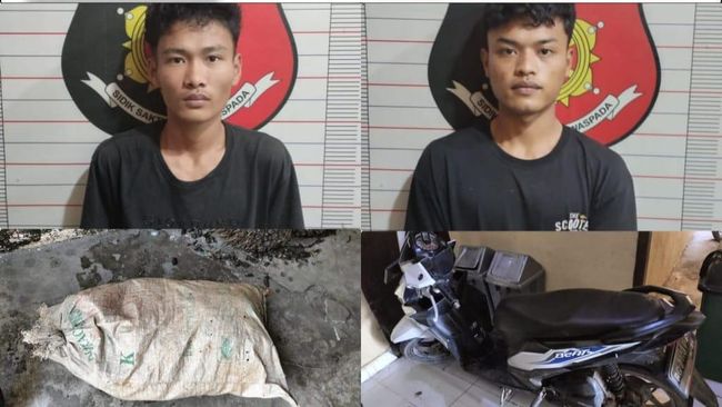 Kemudian korban menelpon anggota polisi, dan anggota mengamankan kedua pelaku berikut barang bukti satu karung berisi beku karet seberat 50 kg dan satu unit sepeda motor Honda BeAT BG 2110 FAK.