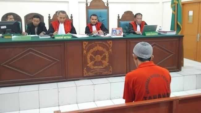 M Fadli, terdakwa kasus pembunuhan di bawah Jembatan Ampera, tertunduk lesu dan pasrah usai mendengarkan vonis 15 tahun penjara yang dibacakan oleh hakim di Pengadilan Negeri Klas 1 A Palembang, Kamis (23/1/2025).