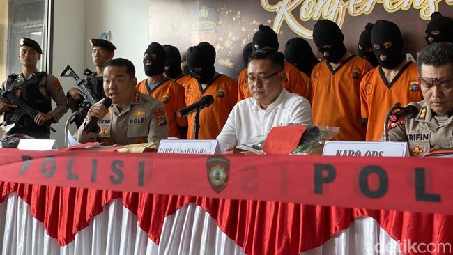 Pantauan detikSumbagsel di Mapolda, sedikitnya ada 19 tersangka yang dihadirkan saat rilis ungkap kasus di depan awak media. Mereka mengenakan baju berwarna oranye, bertopeng dan terlihat pasrah saat digiring petugas.