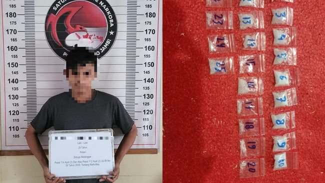 Polisi menangkap bandar narkoba di Muaro Jambi, Jambi. Sebanyak 25 paket kecil sabu siap edar disita polisi.