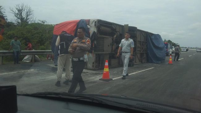 Kecelakaan tunggal terjadi di Tol Kayuagung, OKI, Sumatera Selatan. Bus Miyor rute Padang-Jakarta terguling sehingga mengakibatkan satu orang tewas dan belasan korban luka-luka.