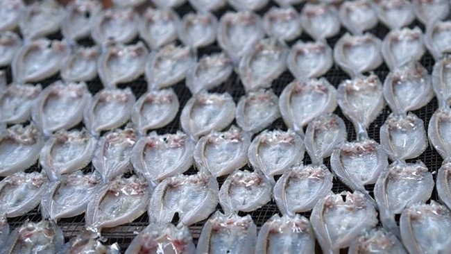 Setelah 2 jam direndam, ikan disusun di atas nampan pengering dengan cara dilebarkan. Posisi bagian dalam perut di sebelah bawah sehingga ketika kering nantinya ikan akan mengembang seperti kupu-kupu.
