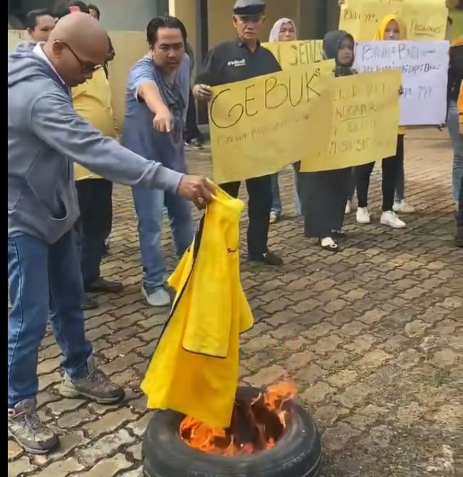 Para simpatisan dan kader itu melakukan aksi sekaligus ikut membakar baju partai. Mereka menuntut agar Golkar segera mengubah rekomendasi buat Pilwako Jambi 2024 yang diserahkan kepada pasangan Maulana-Diza.