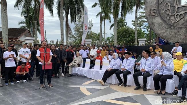 Pantauan detikSumbagsel, Molen-Hakim sebelum mendaftar ke KPU berkumpul bersama ribuan kader parpol dan relawan di tugu Titik Nol Pangkalpinang. Di lokasi, Molen-Hakim menggelar deklarasi di hadapan masyarakat.
