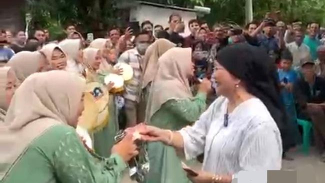Pemberian uang lembaran Rp 100 ribu dilakukan Ketua Pimda PKN Sumsel kepada para emak-emak yang menampilkan hadroh. Seluruhnya diberikan saweran tanpa terkecuali.