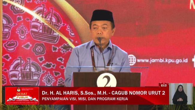 "Kami sampaikan pada malam hari ini soal visi dan misi atau program baru dalam aksi kami ke depan, mana kala kami terpilih kembali menjadi gubernur dan wakil gubernur Jambi," kata Al Haris pada saat debat perdana Pilgub Jambi, Minggu (28/10/2024).
