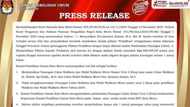 Setelah gaduh atas postingan mendiskualifikasi Paslon Walikota dan Wakil Walikota, Wahdi Siradjudin-Qomaru Zaman pada Pilkada Metro 2024, KPU Kota Metro menghapus postingan tersebut dari akun Instagram-nya.