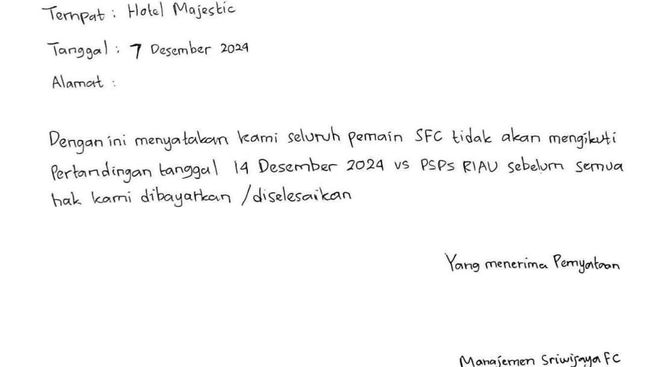 Seluruh pemain Sriwijaya FC membuat surat pernyataan tidak ingin bermain saat menjamu PSPS Pekanbaru di Stadion Gelora Sriwijaya Jakabaring (GSJ) Palembang pada, Sabtu (14/12) mendatang. Surat itu dibuat karena para pemain belum menerima gaji.