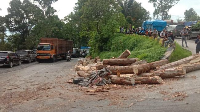 Kayu gelondongan muatan truk itu berhamburan dan menutupi seluruh badan jalan. Polisi dibantu petugas dinas perhubungan kemudian membersihkan lokasi dari tumpukan kayu.