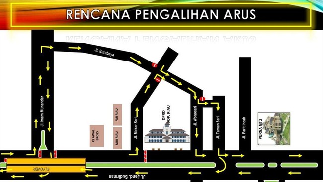 Selanjutnya arus lalulintas dari arah kota menuju bandara yang melintas di depan Kantor DPRD Riau Jalan Sudirman juga akan dialihkan melalui Jalan Mekar Sari.
