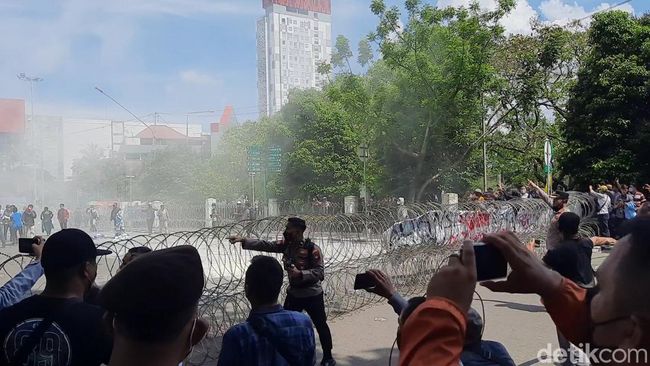 Polisi sempat dua kali membubarkan paksa masa aksi. Pembubaran pertama terjadi tadi siang, kira-kira pukul 13.45 WIB karena dinilai sudah tak kondusif.