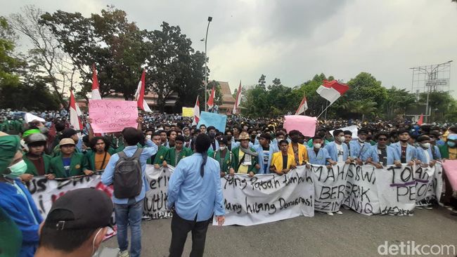 Ribuan anggota aliansi mahasiswa dari berbagai universitas dan perguruan tinggi di Riau menggelar aksi demonstrasi di DPRD Riau di Pekanbaru. Saat aksi, massa menyindir masalah minyak goreng dan kelangkaan bahan bakar.