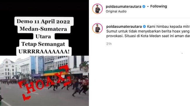 Polda Sumut juga telah memposting terkait video hoaks itu di media sosial resminya. "Kami imbau kepada mitra Polda Sumut untuk tidak menyebarkan berita hoaks yang memancing provokasi. Situasi di Kota Medan saat ini aman dan kondusif," tulis Polda Sumut pada akun resminya.