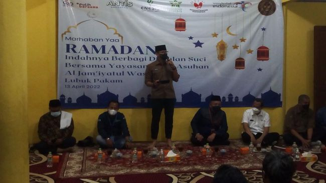 Menteri Pariwisata dan Ekonomi Kreatif (Kemenparekraf) Sandiaga Uno menyambangi panti asuhan Al Jamiyatul Washliyah, Lubuk Pakam, Deli Serdang, Sumatera Utara (Sumut).