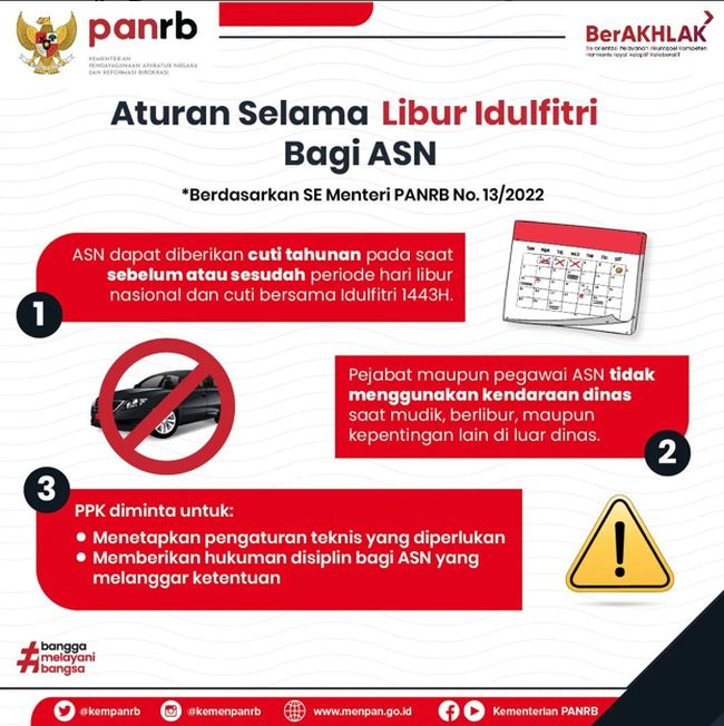 Selain melarang ASN menggunakan mobil dinas, aturan tersebut juga memuat kriteria yang harus diperhatikan oleh seluruh ASN. Surat edaran lengkap dapat diunduh pada laman jdih.menpan.go.id.
