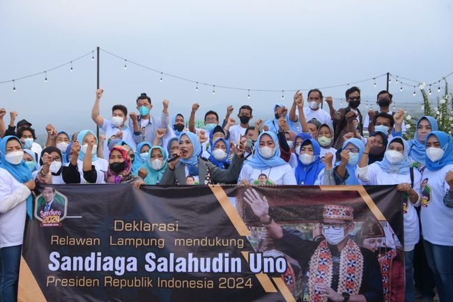 Para relawan yang tergabung dalam Sandi Uno RI 1 Lampung mendeklarasikan dukungannya kepada Menteri Pariwisata dan Ekonomi Kreatif (Menparekraf) Sandiaga Uno sebagai calon presiden 2024. Mereka meyakini Sandiaga Uno mampu menciptakan lapangan kerja baru melalui UMKM.