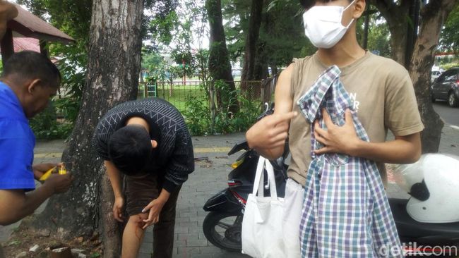 Sementara pengendara itu lalu ditolong oleh warga. Tampak celana panjangnya itu robek. Kakinya pun terlihat luka-luka.