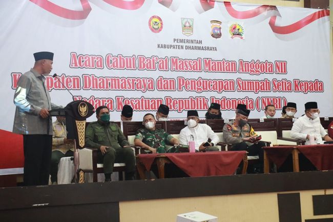 Sejumlah 363 orang yang terpapar paham organisasi terlarang Negara Islam Indonesia (NII) mengikuti acara Cabut Baiat Massal Mantan Anggota NII Kabupaten Dharmasraya dan Pengucapan Sumpah Setia Kepada NKRI. Acara tersebut diadakan di Auditorium Kantor Bupati Dharmasraya, Rabu (27/4).