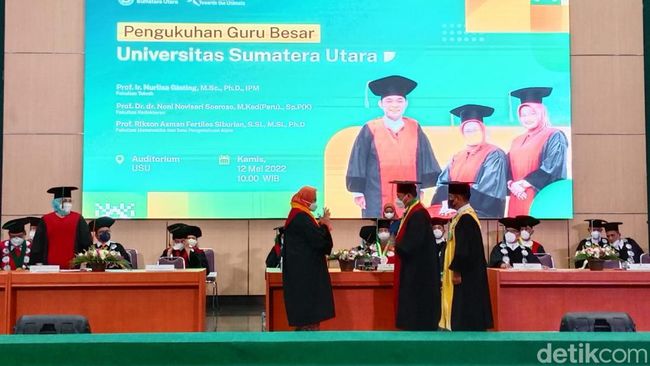 Pengukuhan dilakukan di Gedung Auditorium Kampus USU, di Medan, Kamis (12/5/2022). Prosesi pengukuhan juga turut dihadiri Gubernur Sumatera Utara, Edy Rahmayadi.