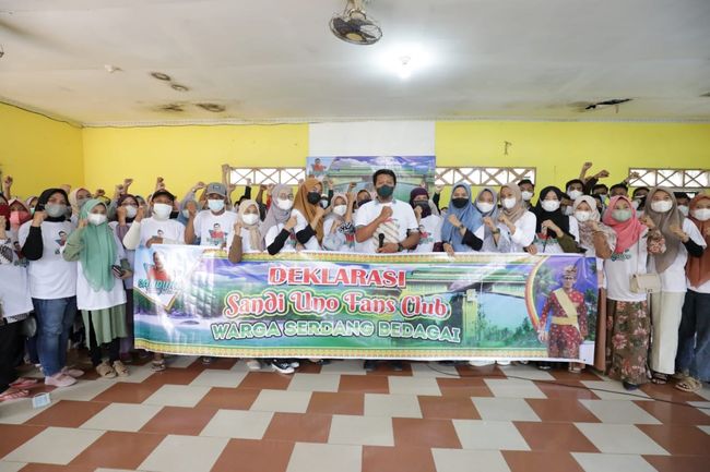 Ratusan relawan Sandi Uno Fans Club Serdang Bedagai, Sumatera Utara mendeklarasikan dukungan kepada Menparekraf Sandiaga Uno untuk maju jadi calon presiden 2024. Dukungan hadir karena Sandiaga dinilai bisa memajukan perekonomian semua kalangan masyarakat.