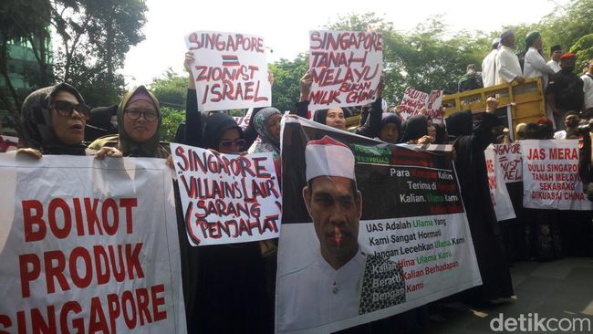 Massa tampak memegang bendera merah putih dan bendera tauhid dipegang. Tampak juga memegang sejumlah spanduk dan poster. Dalam poster itu tertulis 'boikot produk singapore', 'Singapore benci islam', "Usir Dubes Singapore'.