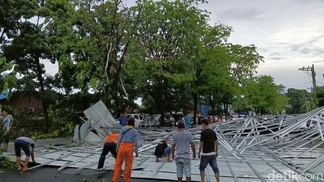 "Tadi memang ada angin kencang dan hujan deras di sini. Lalu tiba-tiba seng atap bengkel itu diterjang angin sampai ke jalan raya," kata Rahmat, warga sekitar.