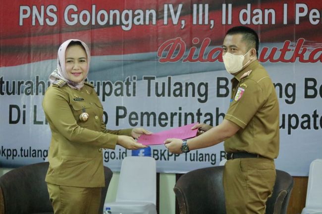 Bupati Tulang Bawang Winarti bersilaturahmi sekaligus menyerahkan surat keterangan (SK) kenaikan pangkat untuk PNS di Pemerintah Kabupaten (Pemkab) Tulang Bawang, Senin (23/5/2022). Ada 268 PNS yang mendapatkan kenaikan pangkat periode April 2022.