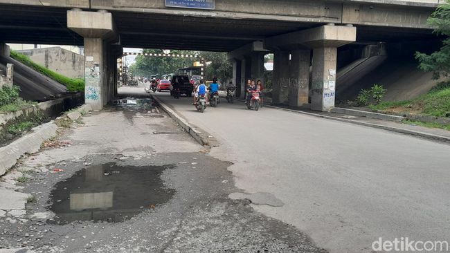 Pantauan di lokasi Jumat (20/8/2021) pukul 13.35 WIB, jalan ini berada tepat di bawah jalan tol. Kondisi jalan utama di lokasi ini terlihat menurun dan digenangi air setinggi 20 cm.