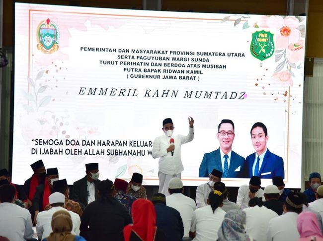 Gubernur Sumut Edy Rahmayadi melaksanakan doa bersama untuk anak Gubernur Jabar Ridwan Kamil, Emmeril Kahn Mumtadz atau Eril. Doa itu digelar bersama warga Sunda di Sumut.